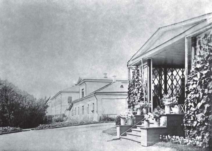 Красные Буйцы. Вид части дома Олсуфьевых с южной стороны. Справа стеклянный балкон с выходом из библиотеки и большой гостиной, Далее отдельно стоящий флигель и двухэтажное здание конторы. Конец XIX века. Частное собрание, Москва