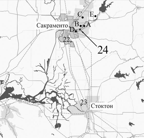 Карта центральной части штата Калифорния, позволяющая получить представление о взаимном расположении мест нападений насильника из восточного Сакраменто по состоянию на начало октября 1977 г. Условные обозначения: точки А, В, С, D и E места локализации на небольшой площади ранних нападений (А эпизоды 1, 3, 6, 8 и 15 в Ранчо Кордова; В эпизоды 2, 7, 21 в Кармайкле; С эпизоды 4, 13, 17 в Цитрус-Хайтс, D эпизоды 11 и 18 у восточной границы г. Сакраменто; E эпизоды 16 и 19 в Оранджвэйле); точка «22» место нападения 22 мая 1977 г в южном Сакраменто (последнее преступление перед летним перерывом); точка «23» место нападения в ночь на 6 сентября 1977 г в Стоктоне; точка «24» место нападения в ночь на 1 октября 1977 г в дуплексе на Таоламн-драйв в Ранчо-Кордова. Последнее нападение совершено в самом эпицентре активности серийного насильника, даже удивительно, как ему в очередной раз удалось реализовать свой весьма рисковый замысел!