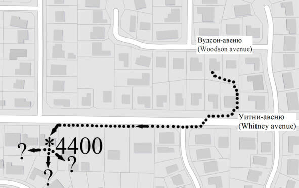 Схема бегства нападавшего с места совершения преступления до дома 4400 по Уитни-авеню. Пунктиром показан путь движения преступника, знак * обозначает дом, возле которого обе служебные собаки потеряли след. Поскольку было непонятно, куда же преступник двинулся от дома 4400, полицейские заподозрили, что тот спрятался в здании.