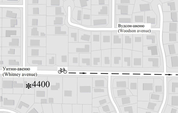 Схема, иллюстрирующая рассказ владелицы косметического салона о подозрительном человеке, доставшим припрятанный в прицепе велосипед, и уехавшим на нём в восточном направлении по Уитни-авеню. Знаком * обозначен дом 4400 по Уитни-авеню, возле которого служебные собаки потеряли след преступника. Символический значок велосипеда обозначает место сокрытия транспортного средства в прицепе со строительным мусором. Легко заметить, что насильник, покидая место совершения преступления, пробежал мимо спрятанного велосипеда и забежал во двор дома 4400. Логика его действий свидетельствует о расчётливости, сметливости и даже прозорливости. Он понимал, что может не успеть покинуть на велосипеде район полицейского оцепления, поэтому решил вообще не предпринимать такой попытки. Выждав 2,5 часа, он сел на заблаговременно припрятанный велосипед и поехал на нём, не привлекая к себе особого внимания, словно местный житель, намеревающийся купить в ближайшем магазине бутылку молока. Потрясающие самообладание и нестандартность мышления!