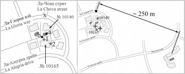Представленные схемы позволяют в первом приближении составить представление о взаимном расположении объектов, связанных с двойным убийством 2 февраля 1978 г, и общем развитии тех драматических событий. Слева: район пересечения Ла-Глория вэй и Ла-Алегриа драйв с указанием улиц и номеров домовладений. Условные обозначения: Х участок на пересечении Ла-Чова стрит и Ла-Глория вэй, на котором произошёл некий конфликт с участием потерпевших и был произведён первый выстрел, привлёкший внимание свидетелей; точка «а» чаша бассейна без воды во дворе дома 10140 по Ла-Глория вэй, в которой был найден пикенес погибших; точка «b» пролом в ограде между домовладениями, через который погибшие проникли на задний двор дома 10165 по Ла-Алегриа драйв; "+1» место обнаружения мужского трупа; "+2» место обнаружения трупа женщины у запертой калитки из двора на улицу. Даже простейший анализ убеждает, что погибшие пытались скрыться с места первоначального конфликта, их преследовали и расстреляли. Справа: схема, демонстрирующая удаленность места проживания погибших в многоквартирном доме «Медоус апартментс» на Малага-вэй, и района совершения преступления. Точкой показано место первоначального конфликта, а знаки "+" обозначают места обнаружения тел расстрелянной пары. Очевидно, что погибшие находились в районе хорошо им знакомом и относительно безопасном по их мнению (иначе они не гуляли бы там с собачкой).