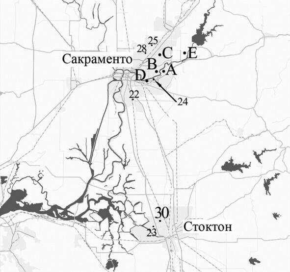 План, демонстрирующий географическую локализацию активности насильника из восточного Сакраменто. После нападения, совершенного 6 сентября 1977 г в Стоктоне (эпизод 23), преступник вернулся в хорошо знакомый ему район к востоку от г. Сакраменто, где на протяжении осени и зимы совершил ещё 6 нападений разной степени успешности. Условные обозначения: точки А, В, С, D и E места локализации на небольшой площади ранних нападений (А эпизоды 1, 3, 6, 8 и 15 в Ранчо Кордова; В эпизоды 2, 7, 21 в Кармайкле; С эпизоды 4, 13, 17 в Цитрус-Хайтс, D эпизоды 11 и 18 у восточной границы г. Сакраменто; E эпизоды 16 и 19 в Оранджвэйле). Точки с числами обозначают номера нападений в их хронологической последовательности: «22» место нападения 22 мая 1977 г в южном Сакраменто (последнее преступление перед летним перерывом); «23» место нападения в ночь на 6 сентября 1977 г в Стоктоне (первое после летнего перерыва) и т. д. Точка «30» показывает примерно расположение дома адвоката Чарчилла на Медоу-авеню в Стоктоне, явившегося местом преступления в ночь на 18 марта 1978 г. После серии из 6 нападений в восточных районах округа Сакраменто, преступник вновь появился в Стоктоне, где его уже никто не ожидал увидеть.