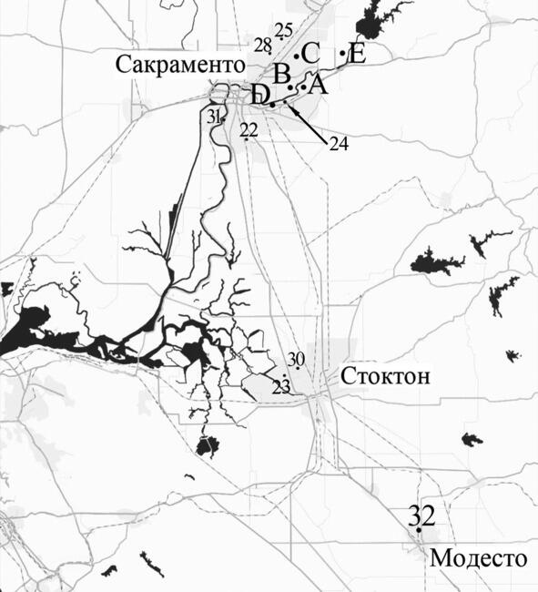 Схема центральной Калифорнии, демонстрирующая географическую локализацию активности насильника из восточного Сакраменто по состоянию на первую декаду июня 1978 г. Условные обозначения: точки А, В, С, D и E места локализации на небольшой площади ранних нападений (А эпизоды 1, 3, 6, 8 и 15 в Ранчо Кордова; В эпизоды 2, 7, 21 в Кармайкле; С эпизоды 4, 13, 17 в Цитрус-Хайтс, D эпизоды 11 и 18 у восточной границы г. Сакраменто; E эпизоды 16 и 19 в Оранджвэйле); точки с числами обозначают номера нападений в их хронологической последовательности. Точка 32 соответствует нападению Гиены в ночь на 5 июня 1978 г на семью в доме на улице Фьюща-лэйн в Модесто. Удаленность этого места преступления от района его первоначальной активности в Ранчо Кордова составляла около 100 км. За весь период своей двухлетней активности Гиена никогда ещё не выходил так далеко за границы собственного «ареала». Возрастание опытности и уверенности преступника в своих силах, обуславливали его потребность освоения новых территорий. Перед нами объективный процесс, присущий всем серийным преступникам, остающимся на свободе долгое время.