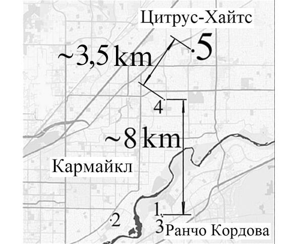 Географическая локализация мест нападений насильника из восточного Сакраменто летом и в начале осени 1976 г. Условные обозначения: 14 места первых криминальных эпизодов в их хронологической последовательности, 5 место нападения утром 5 октября в г. Цитрус-Хайтс. Нетрудно заметить, что после первых нападений, локализованных на очень небольшой территории, преступник принялся расширять область своей активности («ареал»). Это типичное для многоэпизодных сексуальных преступников поведение свои первые вылазки они обычно совершают в непосредственной близости от места проживания, а затем, получив первый опыт, уходят из этого района, рассчитывая сбить с толку правоохранительные органы.