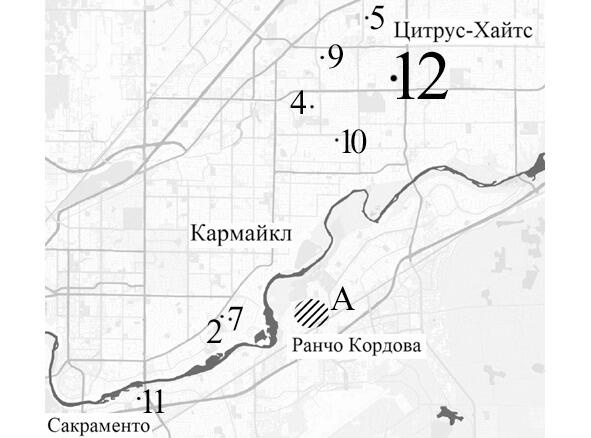 Географическая локализация мест нападений насильника из восточного Сакраменто в 1976 г. и в начале 1977 г. Условные обозначения: А район в г. Ранчо Кордова площадью около 0,4 км.2, в котором преступник летом и осенью 1976 г. совершил 4 нападения (эпизоды 1, 3, 6 и 8); 2, 4,5, 7, 9, 10 и 11 места нападений в различных частях гг. Кармайкл, Цитрус-Хайтс и Сакраменто в их хронологической последовательности; 12 место нападения насильника в южной части Цитрус-Хайтс в ночь на 24 января 1977 г.