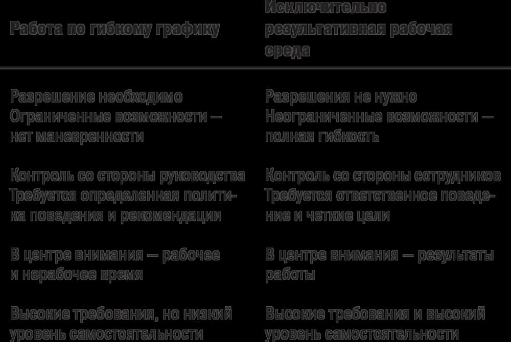 Иными словами, каким гибким ни был бы график работы, он, тем не менее, остается официальным режимом. Гибкий график это оксюморон. Вот почему в условиях ROWE нет никаких режимов.