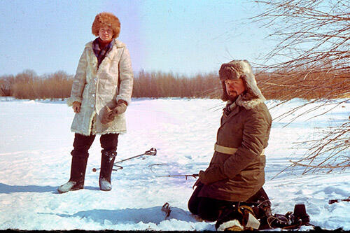 І ось, нарешті, одного ранку свіжий і пухкий перший сніг вкриває сопки розкішною королівською мантією, з якої горностаєвими хвостиками стирчать деінде самотні вічнозелені ялини. Стародавні сопки неначе молодіють, втішаючись новим зимовим нарядом. Сніг виблискує мільйонами коштовних самоцвітів. Він не білий, як у нас. Він весь насичений мерехтливим райдужним сяйвом. Краса невимовна, а особливо казкова вона на кризі річки. На перекатах річка промерзає до дна. Течія ріки спиняється, але «Той, Хто Греблі Рве» власну свободу цінить понад усе, з гуркотом гарматного пострілу розриває він льодові пута і вода з хмарою пари виривається зовні. Пара дивним чином осідає на кригу, утворюючи химерні рослини заввишки з пів валянка. Можна розглядіти і стебла, і мережене листя, і бутони і, навіть, крижані квіти, схожі на троянди. Все це мерехтить веселковим різнобарв'ям. Мерехтить веселковими іскорками і саме повітря. Треба йти, але, якось, ніяково топтати ногами таку красу. Аж душа болить, а йти треба