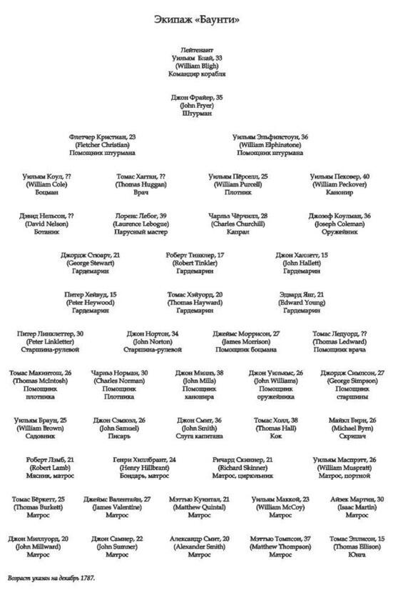 Средний возраст экипажа, по мнению профессора С. Уолруса, составлял 26,4 лет. Судя по сохранившимся записям, из 46 членов экипажа примерно одиннадцати морякам было под сорок, а шестнадцати еще не исполнилось 25 лет. Самым старшим на судне, очевидно, был 40-летний канонир Пековер, самыми молодыми 15-летние подростки Халлетт, Хейвуд и Эллисон. 27 человек из команды «Баунти» ни разу не пересекали экватор. Словом, это была очень разнородная, в основном молодая и неопытная команда.