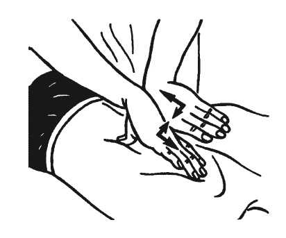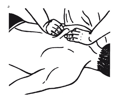 Рис. 59. Воздействие на область грудной клетки по краю реберных дуг: а начало движения; б конец движения