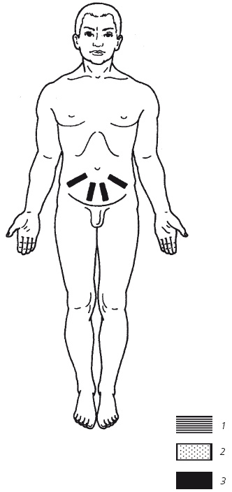1 на коже; 2 в соединительной ткани; 3 в мышечной ткани