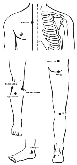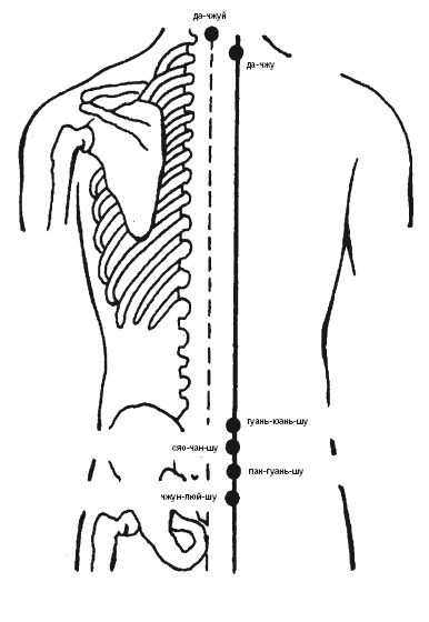 Рис. 66. Точки, используемые при боли в области пояснично-крестцового отдела позвоночника