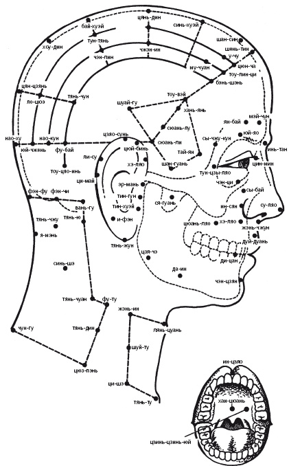 В области глаза ян-бай, сы-чжу-кун, тун-цзы-ляо, чэн-ци, сы-бай, инь-тан (все точки чаще всего используются при воспалительных заболеваниях носа, невралгиях тройничного и лицевого нервов, при тиках, контрактурах мимических мышц).