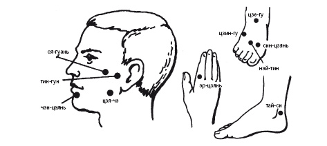 Рис. 22. Точки воздействия при зубной боли различной локализации