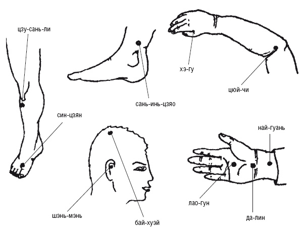Методика точечного массажа тормозная, седативная, расслабляющая, по 23 мин воздействия. При изменении артериального давления и головной боли добавить воздействие на точку ХЭ-ГУ (вершина между 12-м пальцами кисти при их сжатии). Также можно приложить размятые капустные листья или взять свежую лимонную корочку (удалив белое вещество) и внутренней стороной удержать около больного места. Выпить стакан клюквенного сока.