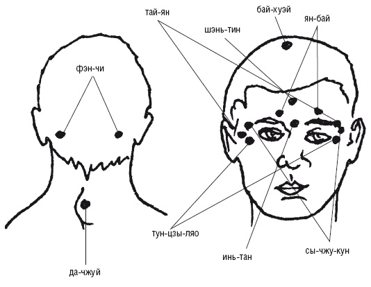При боли головы в области темени воздействуют на БАЙ-ХУЭЙ наивысшую точку головы при движении по сагиттальной линии от СУ-ЛЯО вверх и по фронтальной от верхней части ушных раковин до места их условного пересечения.