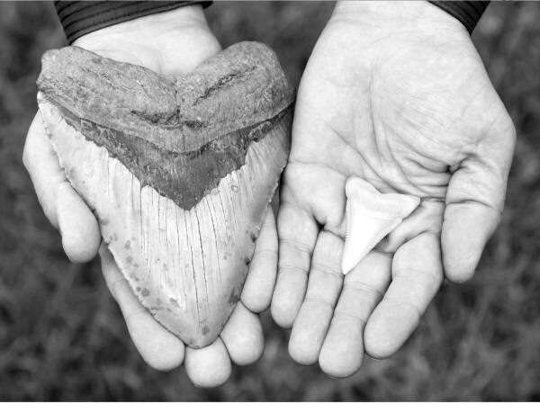 Зуб мегалодона по сравнению с зубом большой белой акулы