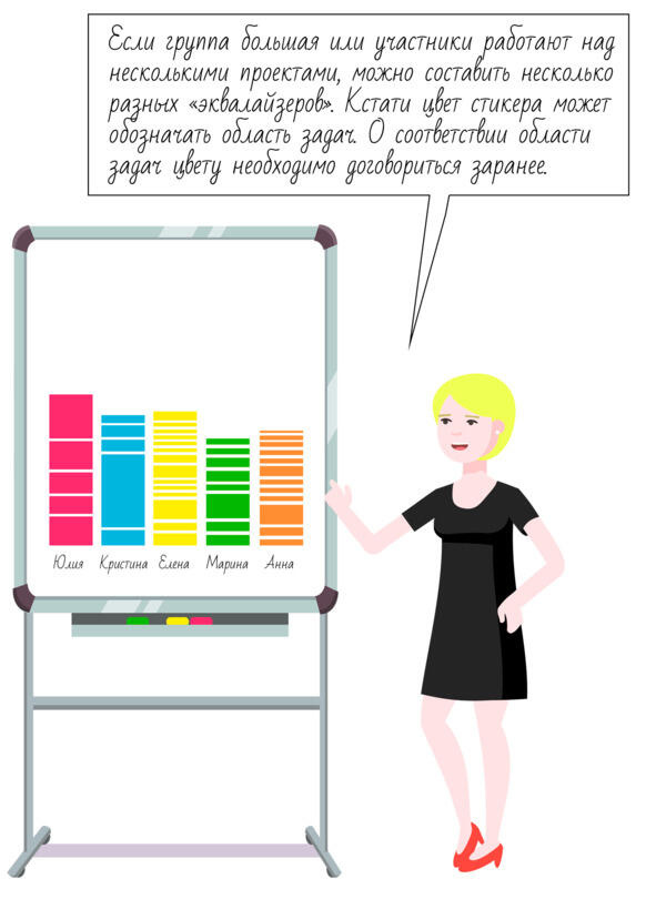 1. Выберите большую ровную стену, на которой будет располагаться «эквалайзер» с планом действий. По горизонтали обозначьте «дорожки», приклеив белый стикер с именем и фамилией участника.