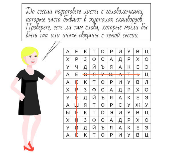 Это прекрасный метафорический инструмент, помогающий собрать ожидания и «присоединить» личные мотивы участников к целям сессии.