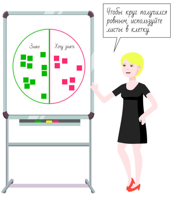Необходимые материалы: несколько листов флипчарта, маркеры двух цветов, стикеры того же цвета, что и маркеры.