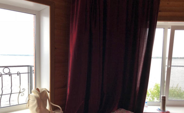 В Осташкове мы забронировали трехместную комнату в частном доме «Любовь». Хозяйка имеет свои «пунктики» по множеству вопросов, но комната была в общем то хорошая. Главное ее достоинство замечательный вид на озеро. Дом стоит на берегу, имеет собственный причал. Дочка смеялась над дизайнерскими экспериментами хозяйки. «Стиль «лакшери», определила она. Балдахин над кроватью темно-бордового цвета с бахромой и оборками, такое же вычурное покрывало и шторы. Зато был маленький холодильник, телевизор, туалет и душ.