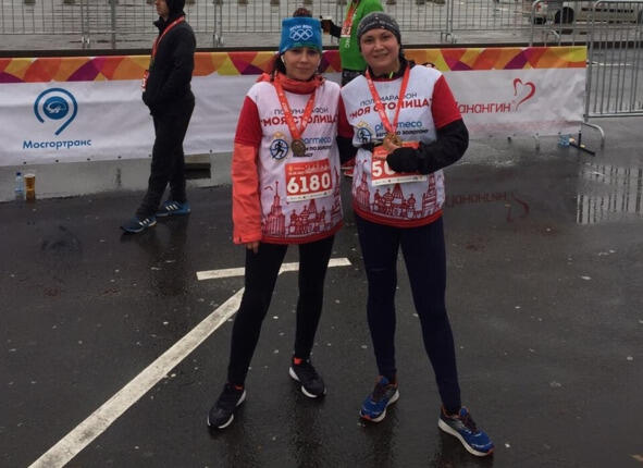 Мы с Юлькой останавливались пару раз, чтобы проглотить гель и сходить в туалет. Туалеты тоже стоят на дистанции, забег-то долгий. С дистанции не сошли, ничего не срезали, но последние метров 100150 шли уже пешком, еле волоча ноги. Перед самой финишной аркой нашли силы пробежаться и красиво финишировать. Моя дочь и зять уже стояли в ожидании и снимали видео этого исторического и героического момента: их мать пробежала впервые в жизни 21 км. Девочки-волонтеры вручили медаль. Тут же была устроена фотосессия. Ну все как полагается у девочек.