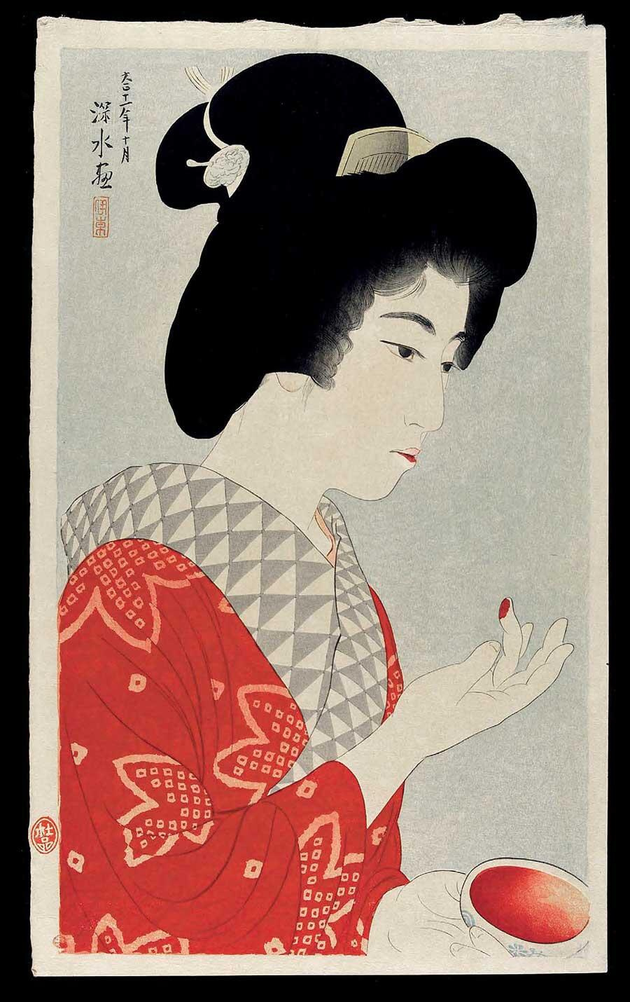 Юная гейша-ученица наносит «бени» (помаду) из чашки, поверхность которой покрыта слоем сухого сафлора. Намокая, он превращался в густо-красную краску. Так «бени» красили губы со времен периода Эдо.