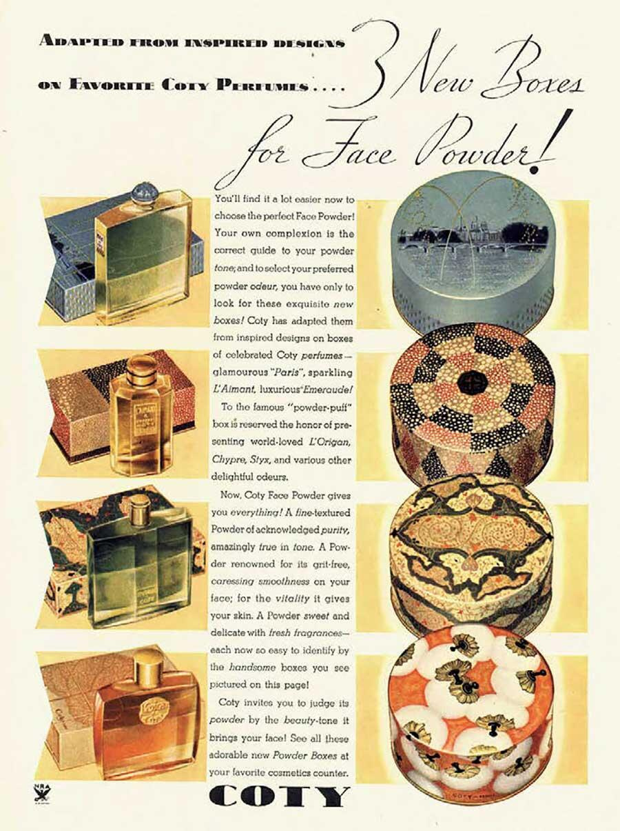 Реклама Coty 1930-х годов демонстрирует неповторимый подход компании к созданию красивой упаковки.