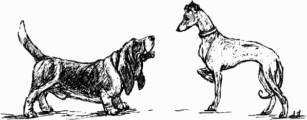 Самые общие черты сложения, можно сказать принцип сложения, называются конституцией. Однако конституция это не просто размеры, форма и степень массивности тела и его частей; с телосложением обычно довольно жестко связаны некоторые особенности нервной системы и физиологии, то есть тип конституции включает в себя еще и поведение собаки и ее физические возможности. Всего типов конституции пять. Сырой (он же рыхлый), грубый, крепкий, сухой и нежный. Возбудимость и подвижность нервных процессов растут от сырого к нежному типу. Нежный тип часто отличается слабостью нервной системы, а сырой преобладанием торможения над возбуждением и, как следствие, вялостью. Кроме того, собаки сырого типа рано дряхлеют. Для грубого типа характерен флегматический темперамент[2], для крепкого сангвинический и для сухого холерический. Как вы, наверное, сами догадываетесь, всё это не железный закон, а только тенденция, хотя и хорошо выраженная. Но, во всяком случае, нет сырых пород с холерическим темпераментом или нежных с флегматическим.