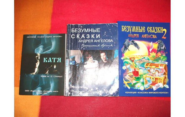 На фото: три книги. Средняя моя первая бумажная книга. 2010 г., тираж 40 (сорок) экз. Слева знаменитая «Катя. Роман на 22 страницах». Тираж: 1 тыс. экз., стр. = 24, год 2012. Справа второй том безумных сказок, 2013 год, тираж 9 тыс. экз.