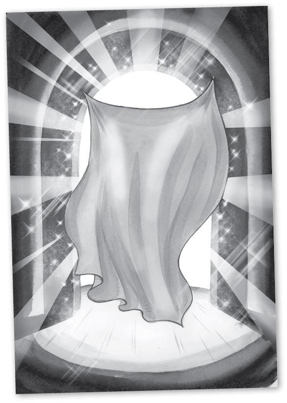 Фея-крёстная отвела нас в южную башню Дворца фей. Комната, где мы оказались, была круглой и совершенно пустой, не считая построенной в самом центре арки. Фея-крёстная потянула рычаг на стене, и под аркой возникла голубая завеса. За ней мы увидели комнату, залитую ярким светом.