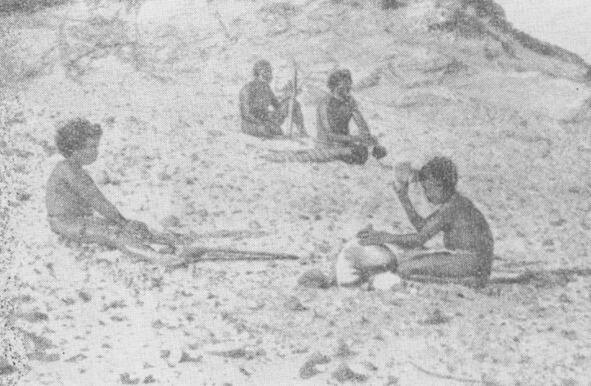 Аборигены Австралии за выполнением трудовых операций по обработке камня