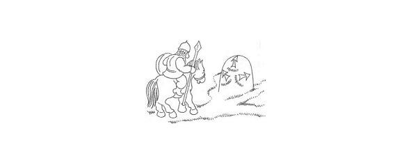 Немного погодя, я, отвлекшись от охотничьей забавы, стал внимательно разглядывать окружавшую нас местность. К удивлению своему, обнаружил я уходящую вдаль от Карканту дорогу. Конечно, не ту, по которой мы сюда только что приехали, а ещё одну! Начиналась она от перекрёстка на окраине. Посреди того перекрёстка возвышался неотёсанный дорожный камень, на котором была высечена интересная надпись. Приблизившись к камню, я прочитал: