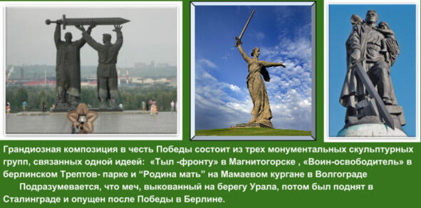 Русский меч символизирует в этой композиции не столько оборону, сколько силу воли объединённого русского народа, сплочённого в одно целое ради достижения нашей общей Победы над врагом. Урал, Сталинград, Германия это ведь путь в Космос, путь через войну добра и зла на Земле, и победу добра; путь необъятный, большой, вечный Россия и Германия по сей день в этой связи очень многим обязаны друг другу!