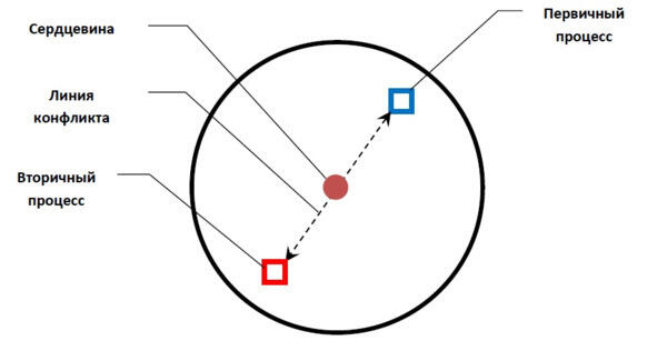 Поляризованные элементы располагаются вокруг некоего центра точки нулевого напряжения. Это центр циклона наших страстей, точка целостности нас самих, где нет противоречий между отдельными проявлениями, но есть они все одновременно. Именно эту точку я и называю Сердцевиной.