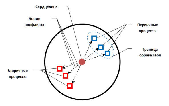 И теперь, когда все пояснительные схемы уже представлены, я хочу сконцентрироваться на очень важном моменте на образе себя. На схеме он представлен в виде области, выделенной синей пунктирной линией. Складывается он из всего многообразия первичных процессов и представляет относительно небольшую область нас самих, внутри которой возможны незначительные флуктуации относительно идеальных представлений о себе.