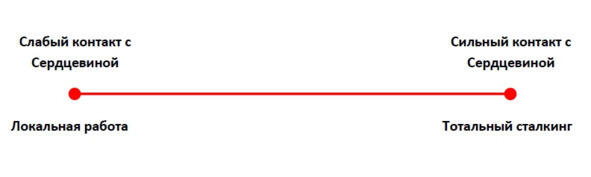 От проявленности Сердцевины будут зависеть цели сталкинга, его тщательность и дальнейшая работа с внутренними конфликтами. При слабом контакте с Сердцевиной на первое место выходит локальная работа, глубокий, качественный контакт предполагает тотальный сталкинг и кардинальные изменения.