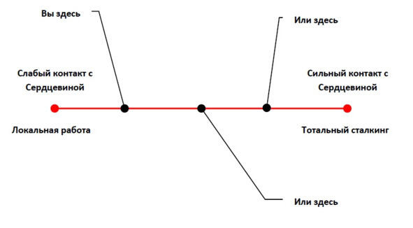 Идея Пути Сердца, с моей точки зрения, предполагает близость к этому полюсу или стремление к нему. В конечном счёте для Пути Сердца оказывается важен тотальный сталкинг, помогающий работать со всем, что уводит на любые другие пути.