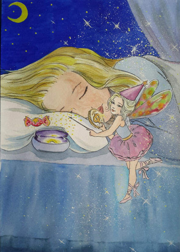 Вечером Маша лежала в кровати, старалась не спать, чтобы увидеть Зубную Фею. Под подушкой, в маленькой жестяной коробочке из-под леденцов, хранился первый выпавший молочный зуб. Поздно вечером дождь перестал. Облака разошлись в разные стороны, словно кто-то их прогнал. Зажглись яркие звёзды в тёмно-синем небе.