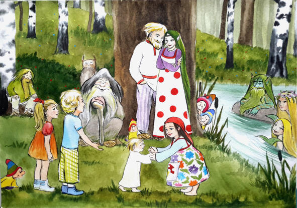 Из-за елей вышли гномы. Водяной и русалки наблюдали издалека, еле двигая хвостами. Небольшая рябь от этого появлялась на глади пруда.