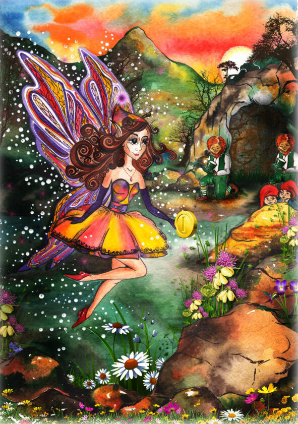 С первыми лучами солнца прилетела Фея! Она летела прямо в пещеру лепреконов после Бала Кувшинок. Ей срочно нужно было поменять старые истрепавшиеся туфельки на такие же, новые, ярко-розовые! В ладошке она несла золотую монету.