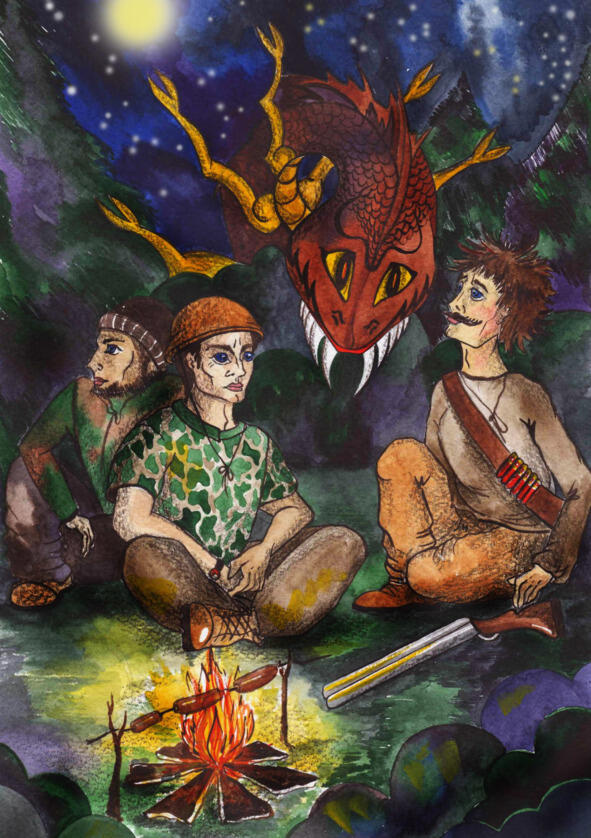Охотник отложил ружьё и перевернул сосиски. Сначала ему послышалось, точно перекатывают большую шину. Ну, откуда ночью, да ещё вдали от мастерской и дороги, может быть шина? Он нагнулся, чтобы взять ужин и передать его сослуживцам. Поднял глаза и замер с сосисками в руках, беззвучно шевеля губами. Парни не могли взять в толк: что с ним? Почему он прекратил свой армейский рассказ? Но, подняв голову вверх, увидели свисающие усы, точно у сома.