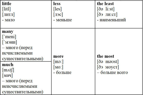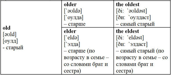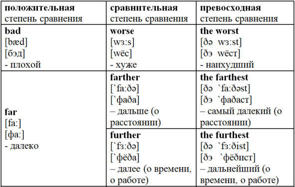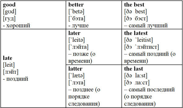 Исключения из правил формирования степеней сравнения прилагательных приведены в следующей таблице: