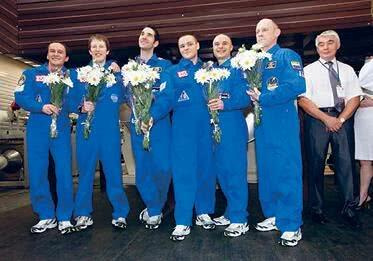Экипаж подготовительного эксперимента проекта «Марс-500» после 105суточной изоляции, командир экипажа Сергей Рязанский слева (фотография Олега Волошина/ИМБП)