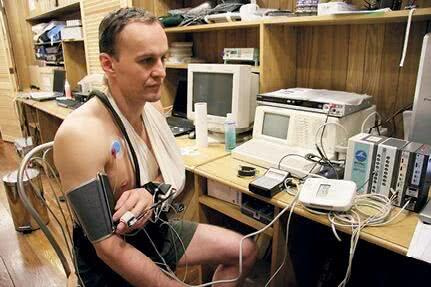 Сергей Рязанский на второй месяц 105суточной изоляции в комплексе проекта «Марс-500» тестирует методику по изучению функций сердечно-сосудистой системы (фотография Олега Волошина/ИМБП)