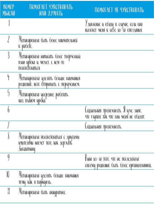 А на ночь у вас будет еще одно задание. Проведите черту вниз от середины листа. Озаглавьте одну сторону: «Что помогает мне избегать чувств». А над другой напишите: «Помогает мне чувствовать или действовать». Теперь напишите в своей записной книжке по одной функции каждой критикующей мысли. Как она подкрепляется, позитивно или негативно, как позволяет вам чувствовать или делать что-то хорошее или не чувствовать что-то плохое. Вот что написала двадцатичетырехлетняя учительница первого класса: