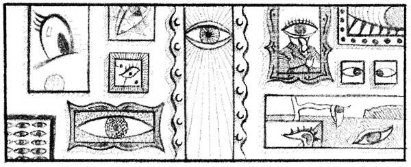 Вайолет оглядела скудно освещенную неряшливую комнату. В течение вашей жизни вам приходилось, наверное, замечать, что людское жилье обычно отражает личность своих обитателей. В моей комнате, например, собраны самые разные предметы, которые представляют для меня особую важность. Среди них пыльный аккордеон, на котором я могу сыграть несколько грустных мелодий, толстая пачка записей о деятельности бодлеровских сирот и давным-давно сделанная, потускневшая от времени фотография женщины по имени Беатрис. Предметы эти для меня очень ценны и дороги. Комната в башне тоже содержала вещи, которые, видимо, были важны и дороги для Графа Олафа. Но вещи эти были страшные. Обрывки бумаги, на которых неразборчивым почерком были записаны его злодейские планы; они неопрятным ворохом лежали на «Матримониальном праве», которое он отобрал у Клауса. Тут и там стояло несколько стульев и горело несколько свечей, которые отбрасывали колеблющиеся тени. По всему полу валялись пустые бутылки из-под вина и немытые тарелки. Но больше всего там было рисунков карандашных и маслом, а также вырезанных из дерева изображений глаз больших, маленьких, всяких: глаза на потолке, глаза, процарапанные на грязном дощатом полу, глаза, кое-как нарисованные на подоконнике, а один большой глаз красовался на круглой ручке двери, которая вела на лестницу. Жуткое место!