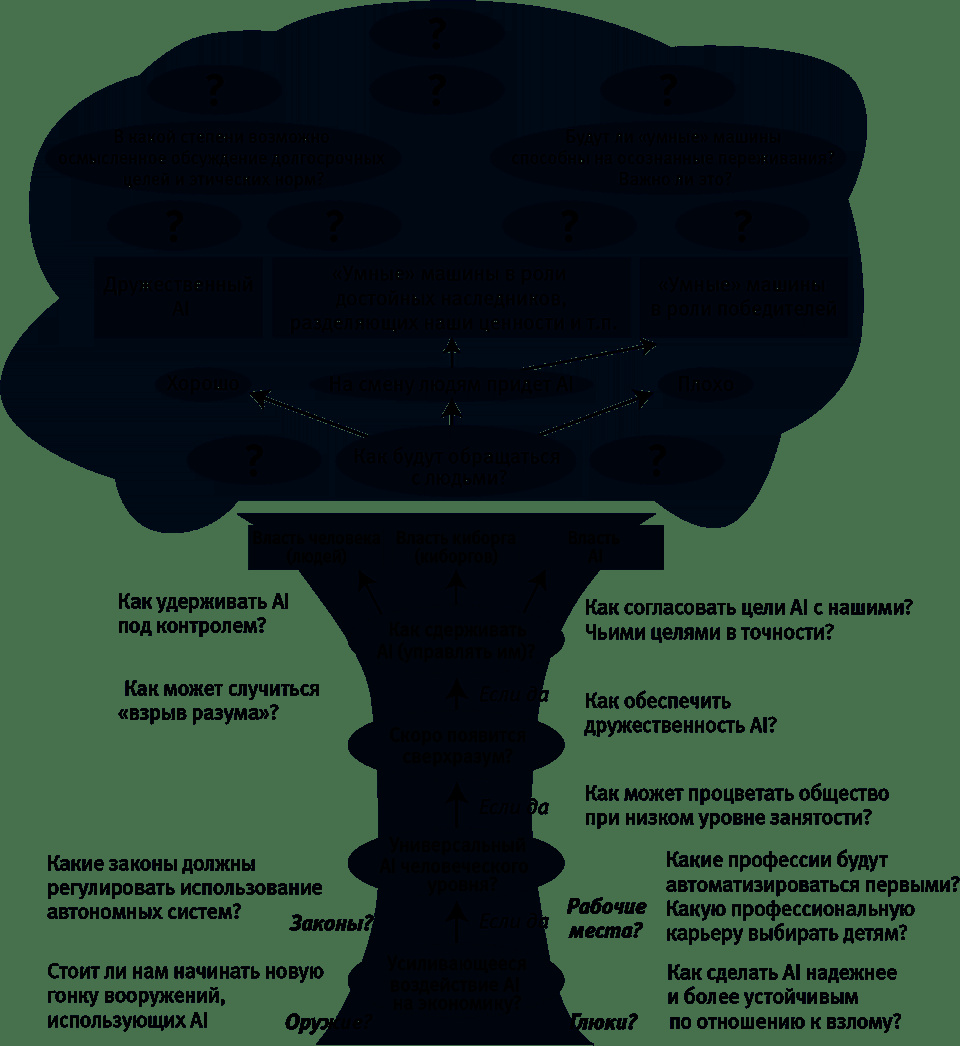 В главе 2 мы исследуем вопрос об основаниях разума и о том, как пассивная и бессмысленная на вид материя может быть реорганизована и, благодаря этому, может обрести способность запоминать, вычислять и учиться. Когда мы перейдем к будущему, наш рассказ разветвится, и каждый из множества возможных сценариев будет зависеть от ответов, данных на ключевые вопросы. На рис. 1.6 эти ключевые вопросы собраны вместе, в том порядке, в каком мы будем с ними сталкиваться по мере совершенствования AI.