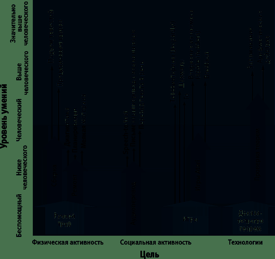 Интеллект, определенный как способность к достижению сложных целей, не может быть измерен единственным показателем IQ, а только целым их спектром, охватывающим все возможные цели. Каждая стрелка на рисунке показывает, насколько успешны лучшие из современных AI-систем в достижении различных целей, откуда ясно, что сегодня системы с искусственным интеллектом обнаруживают определенную узость: каждая система способна достигать только очень специфических целей. В отличие от этого, человеческий разум чрезвычайно широк: здоровый ребенок может успешно учиться практически всему на свете.