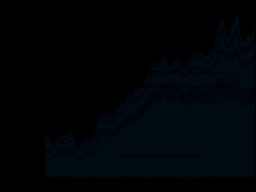 Рост американской экономики в прошлом столетии и распределение доходов среди различных групп населения. До 1970-х рост благосостояния в них проходил синхронно. После этого рост приходился в основном на 1 % самых богатых людей страны, в то время как улучшение благосостояния 90 % практически ничтожно{50}. В приводимых данных учтена инфляция, и доходы вычислены в долларах 2017 года.