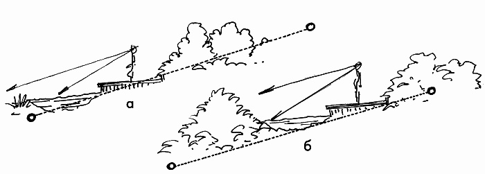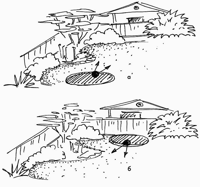 На рисункахаибпоказаны варианты размещения водоема на участке с выраженным склоном. Считается, что если участок имеет рельеф, то водоем должен быть расположен в самом низком месте. Это так, и именно этот вариант изображен на рисункеа. Но если водоем находится не в низине, а на возвышенности, то необходимо расположить растения вокруг него так, чтобы более низкие точки рельефа не просматривались с того места, откуда обозревается водоем (вариант на рисункеб).